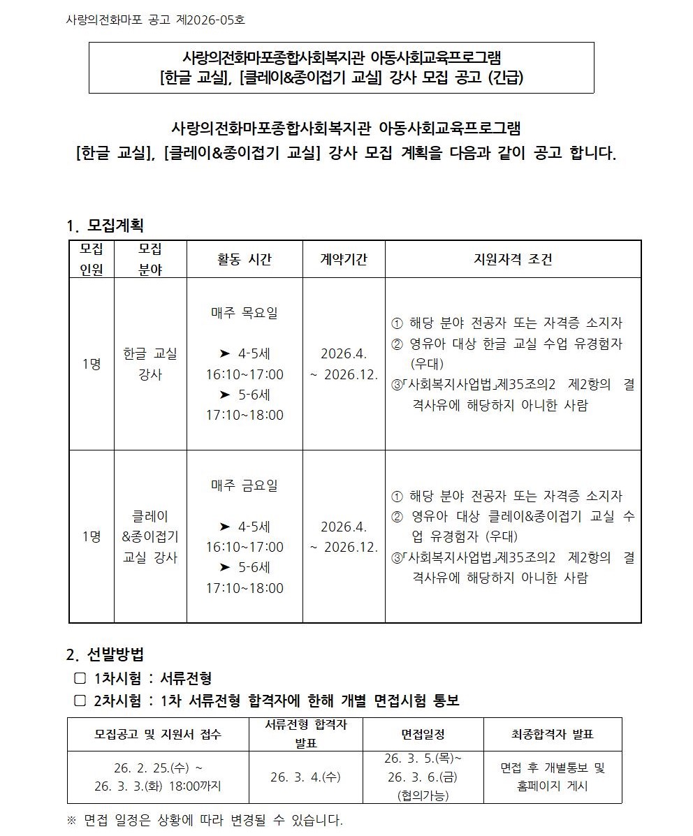 아동사회교육프로그램 [한글 교실] [클레이&종이접기 교실] 강사 모집 공고