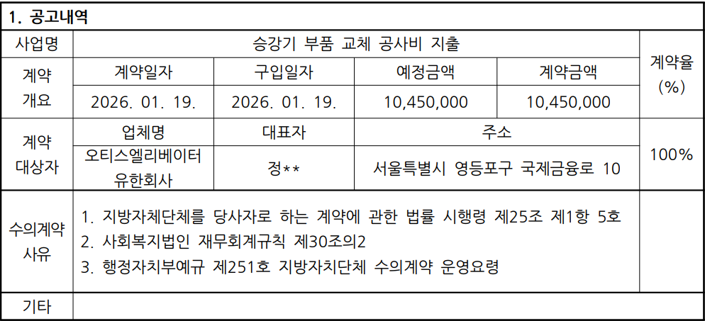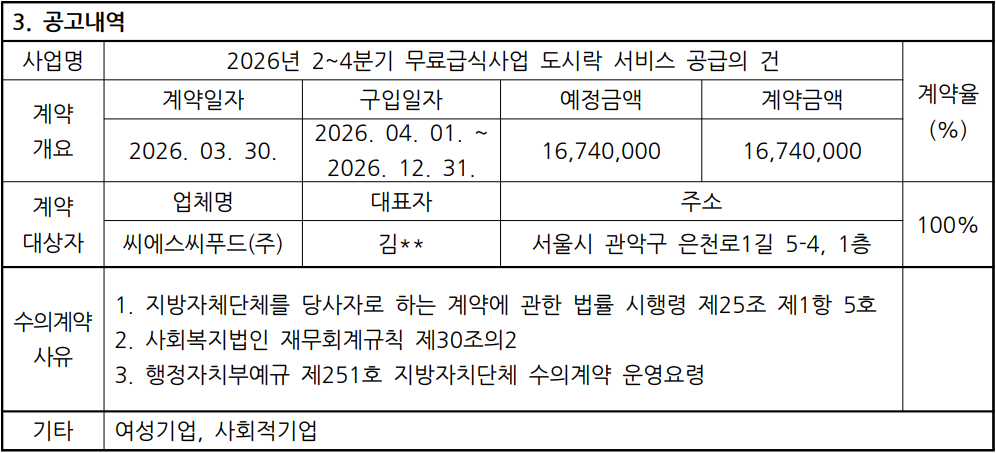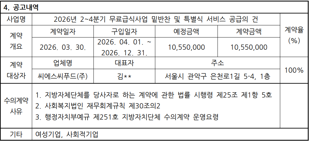 2026년 1분기 수의계약 내역 공고
