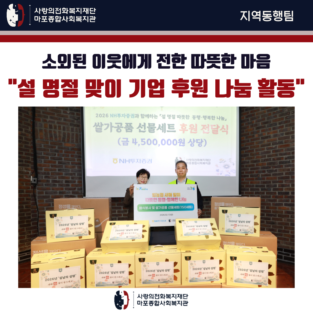 | 이전글 | [지역동행팀]마포복지재단과 함께 온기를 전하는 따뜻한 방한용품 및 선스틱 나눔 | 2026-02-05 |