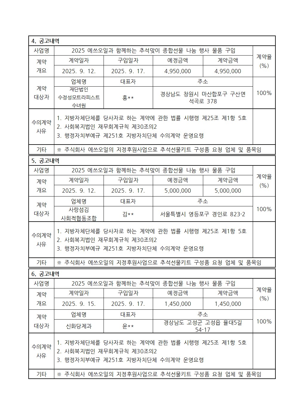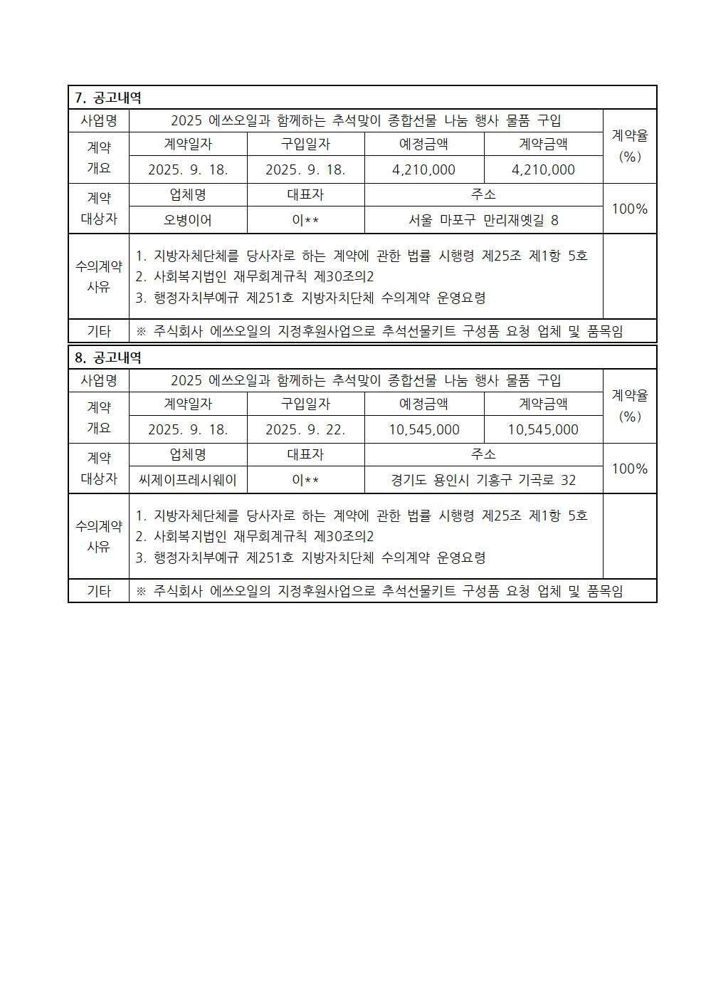 2025년 3분기 수의계약 내역 공고