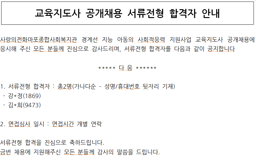 2026년 복권기금 경계선 지능 아동의 사회적응력 지원사업 교육지도사 서류전형 합격자 안내