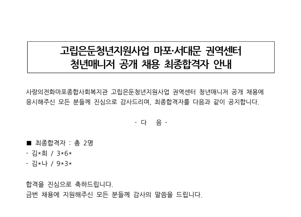 2026년 고립은둔청년지원사업 청년매니저 채용 최종합격자 안내