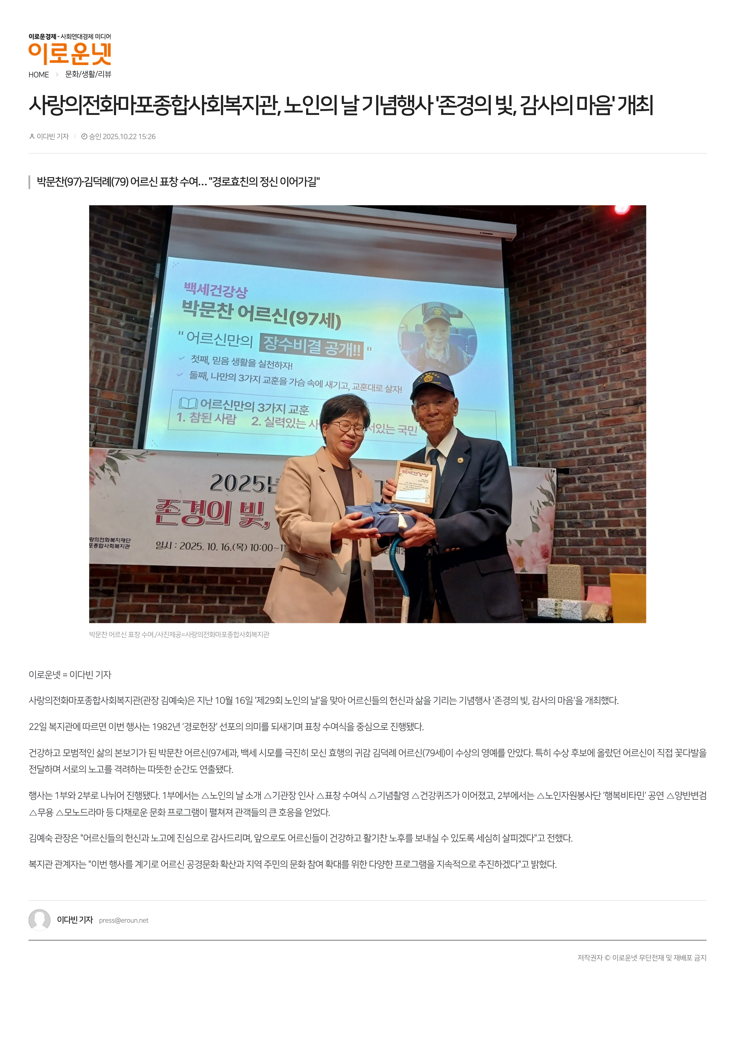[이로운넷-25.10.22.] 사랑의전화마포종합사회복지관, 노인의 날 기념행사 '존경의 빛, 감사의 마음' 개최