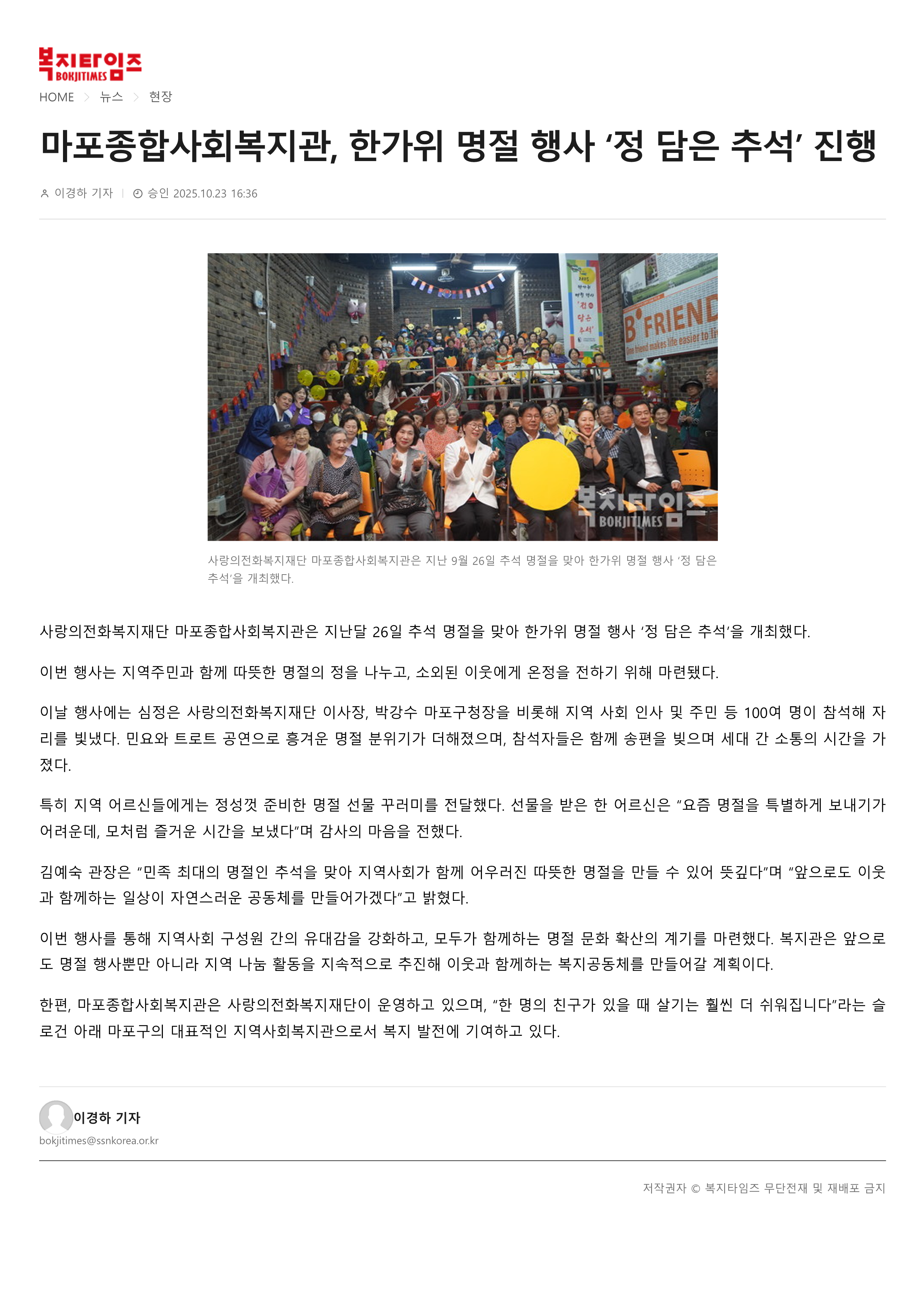 [복지타임즈-25.10.23.] 마포종합사회복지관, 한가위 명절 행사 '정 담은 추석' 진행
