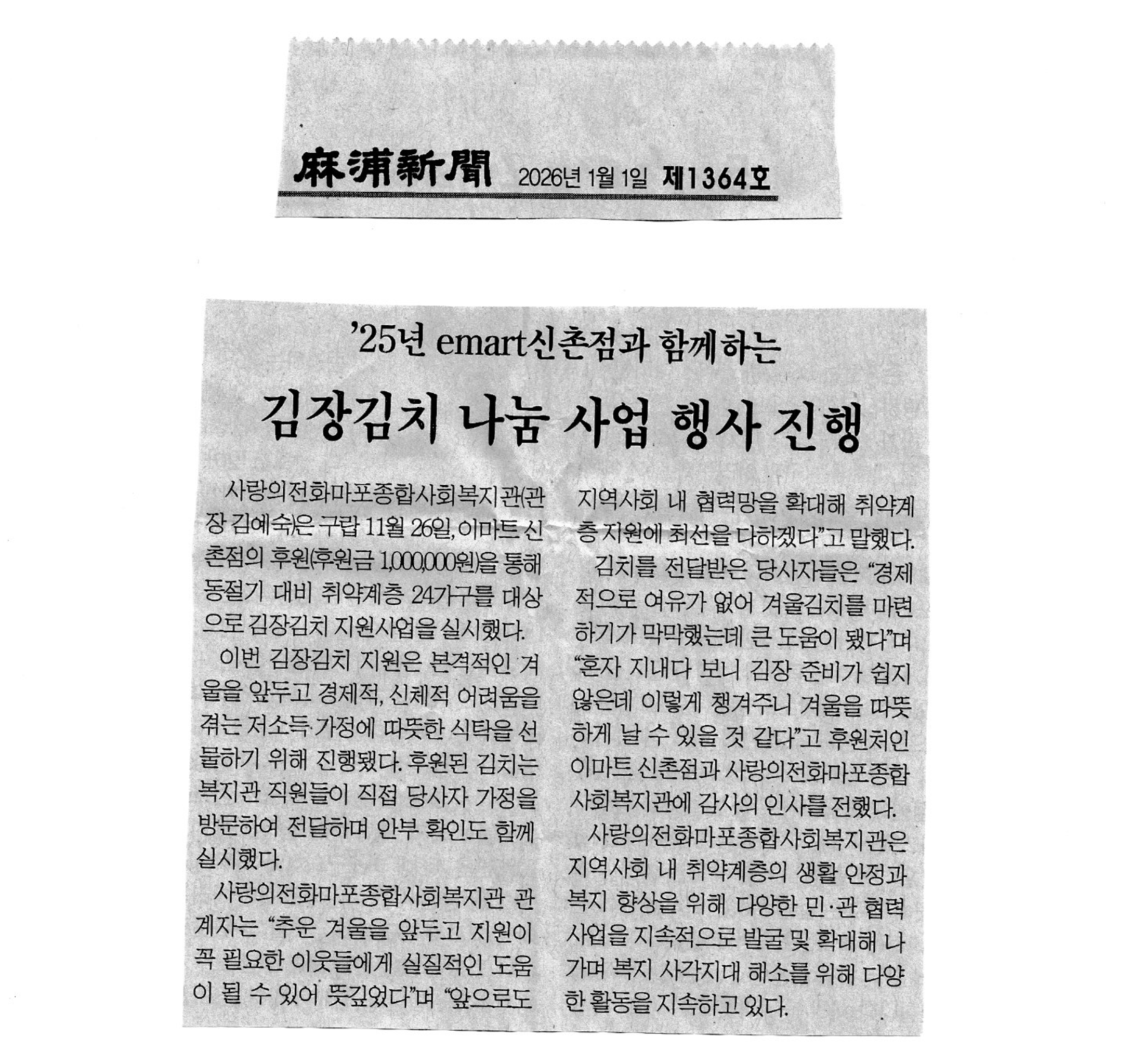 [마포신문-26.01.01.] '25년 emart신촌점과 함께하는 김장김치 나눔 사업 행사 진행