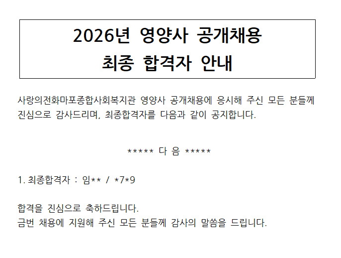 2026년 영양사 공개 채용 최종 합격자 안내