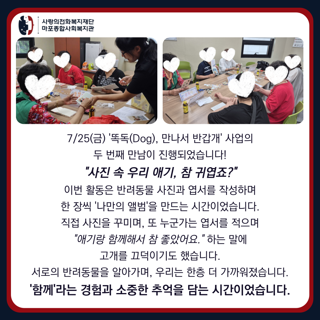 | 다음글 | [지역동행팀] '행복펫밀리' 첫 번째 오픈강좌 <반려동물 식기 꾸미기> | 2025-07-30 |