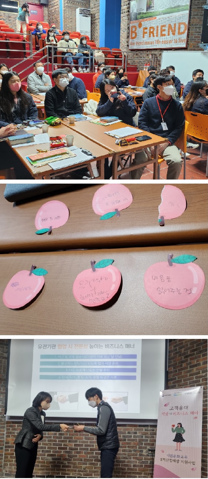 CS전문 강사님과 함께 ‘고객이 만족하는 서비스는 무엇인가?’, ‘직장에서 지켜야하는 매너란?’ 이라는 주제로 2시간에 걸쳐 이론과 실습이 진행되었습니다.