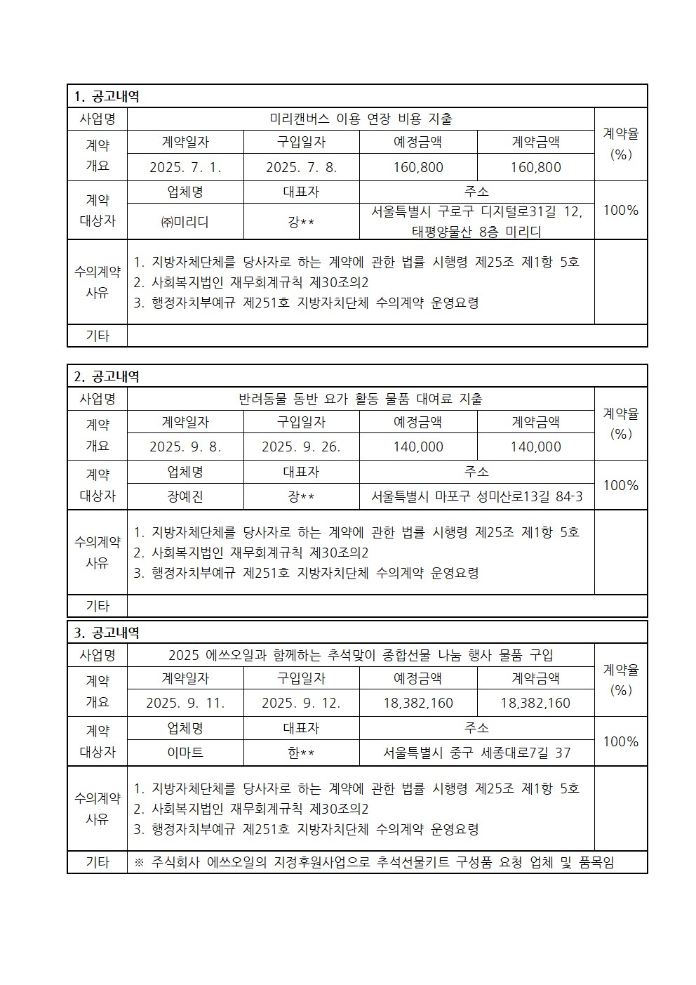 2025년 3분기 수의계약 내역 공고