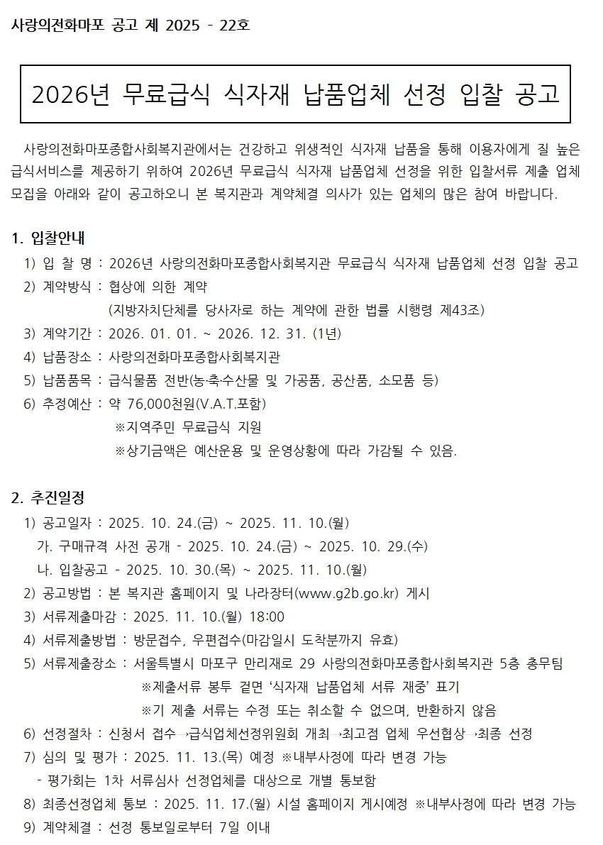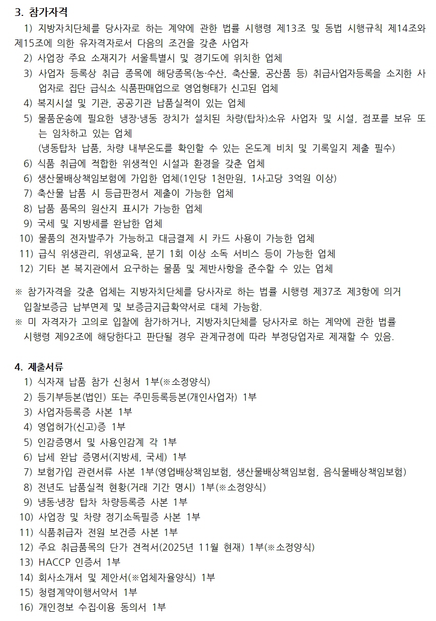 2026년 무료급식 식자재 납품업체 선정 입찰 공고