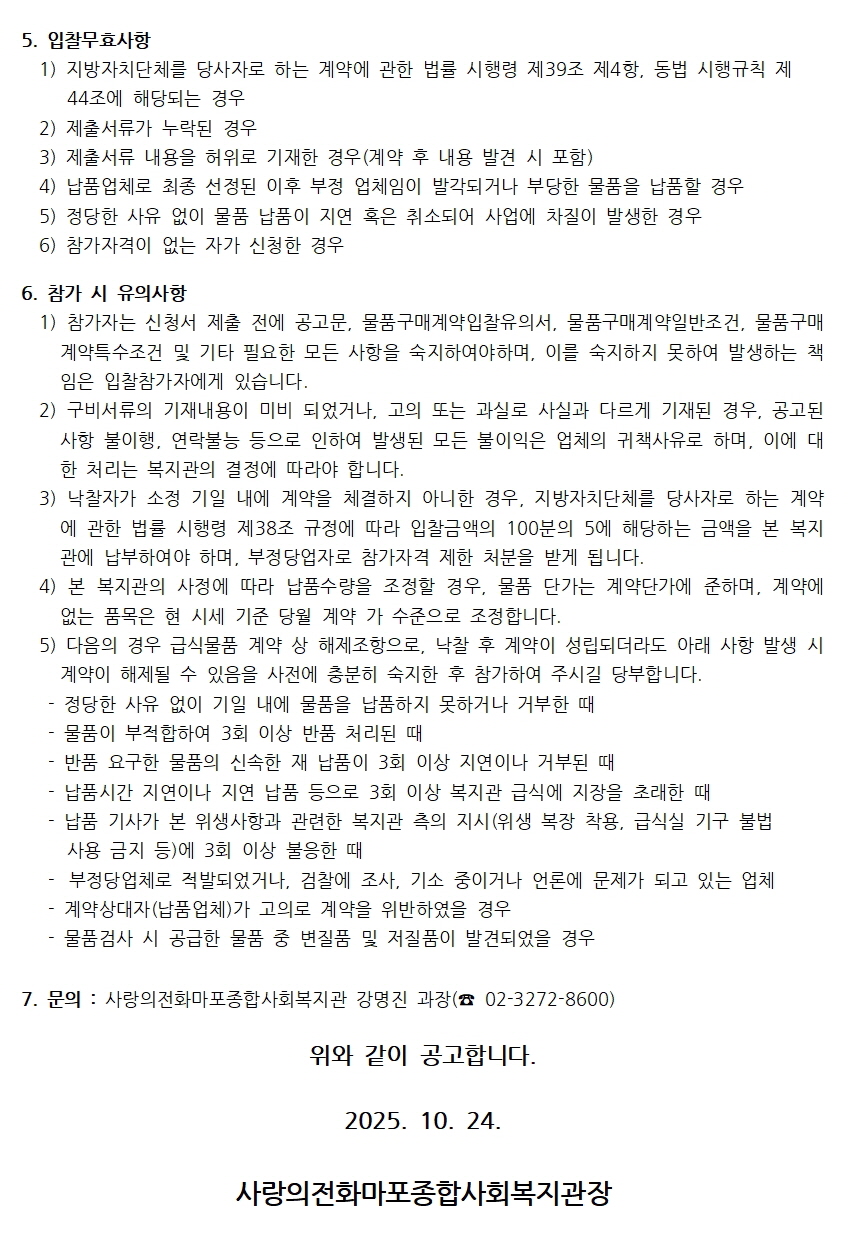 - 파일1 붙임1. 2026년 무료급식 식자재 납품업체 선정 입찰 공고문.pdf (파일크기 : 106.8K / 다운로드 : 26)