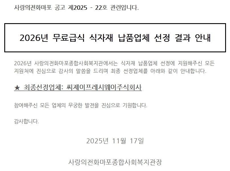 2026년 무료급식 식자재 납품업체 선정 결과 안내