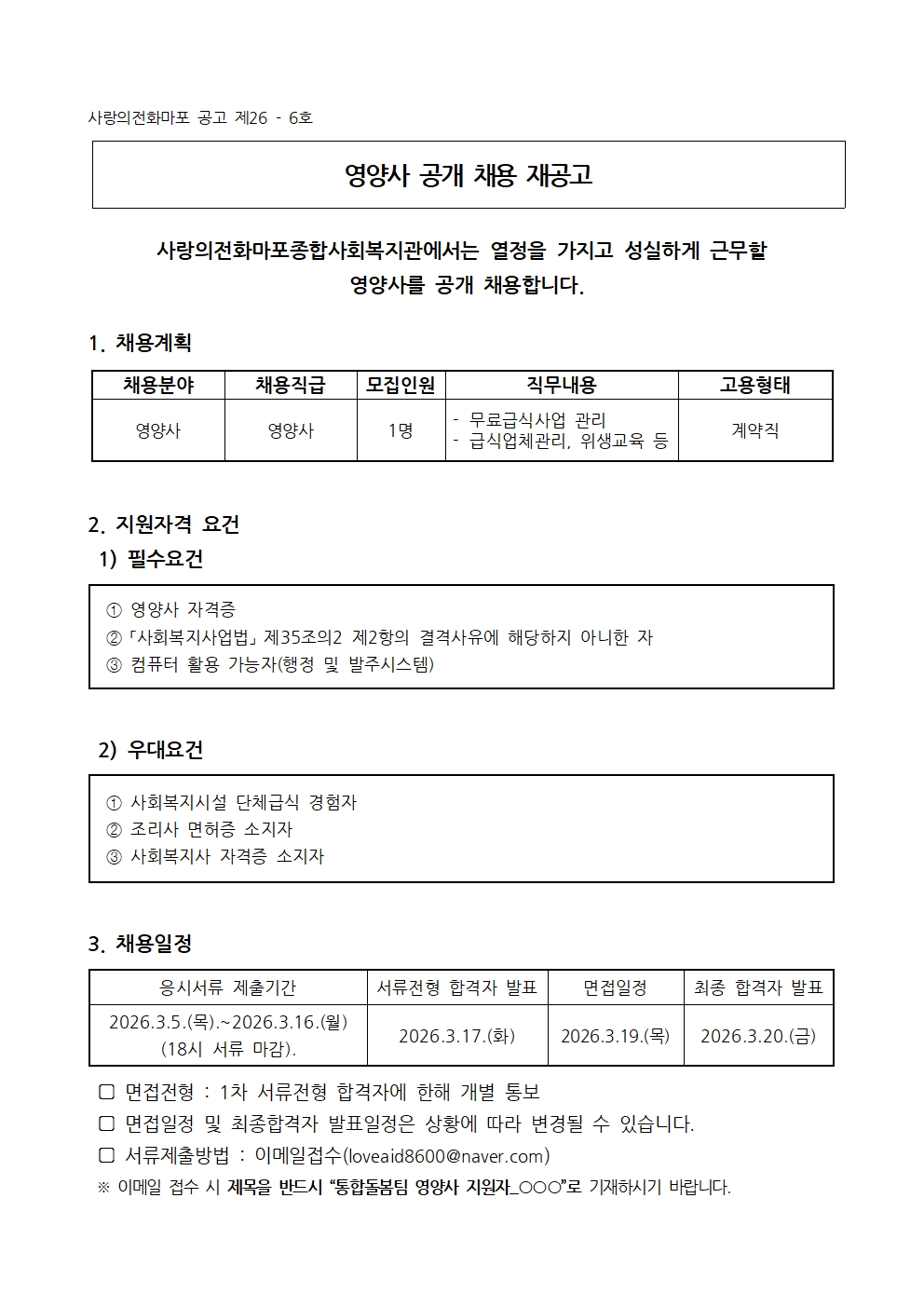2026년 영양사 공개 채용 재공고