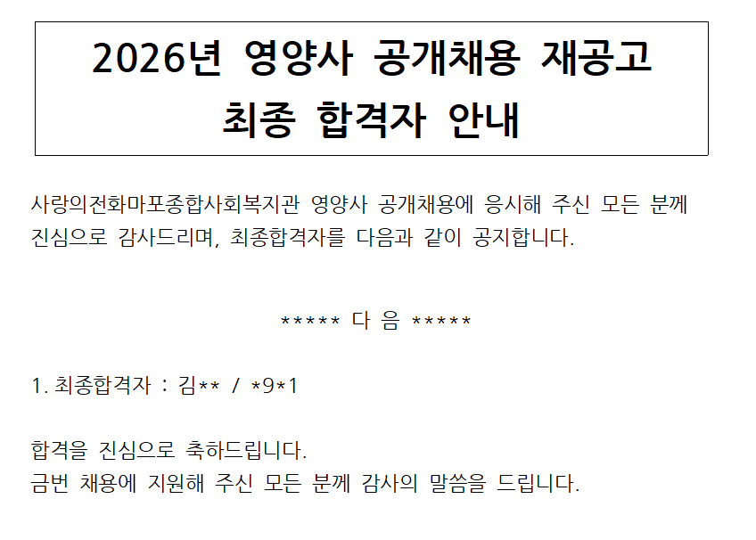 2026년 영양사 공개채용 재공고 최종 합격자 안내